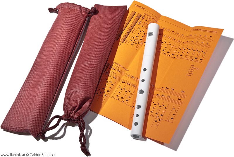 ![]() El flabiol es presenta amb una bossa de color (de roba sintètica), a mode de funda de l'instrument, i amb una tabulatura del flabiol. |